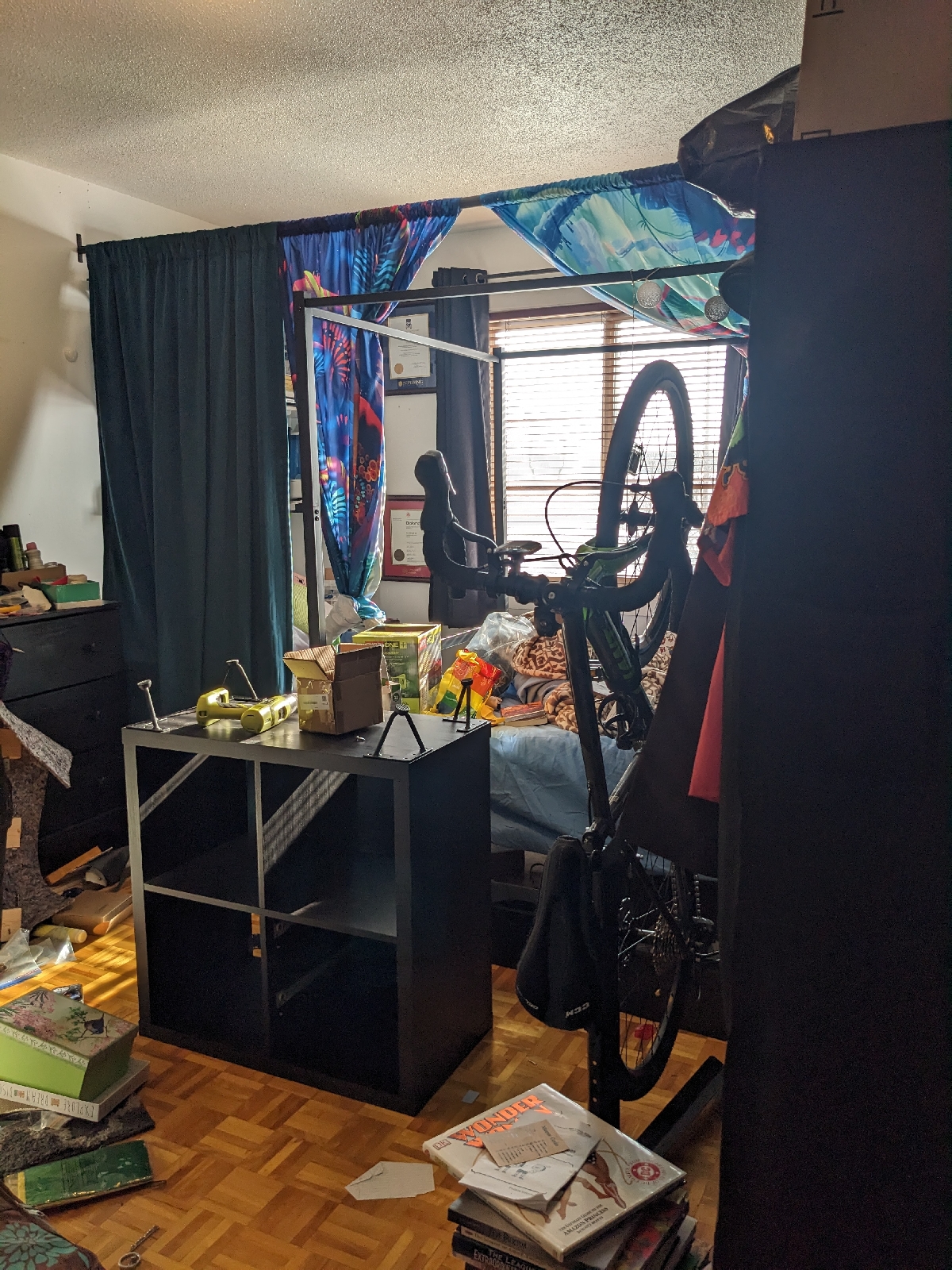 Just before the holidays, I figured out a new plan. This originally included changing to another bed frame that I already had and moving my bed and dresser near the window instead of the door. The canopy frame took up space I wanted for art and I couldn't stretch out fully without my feet touching the footboard, which annoyed me.